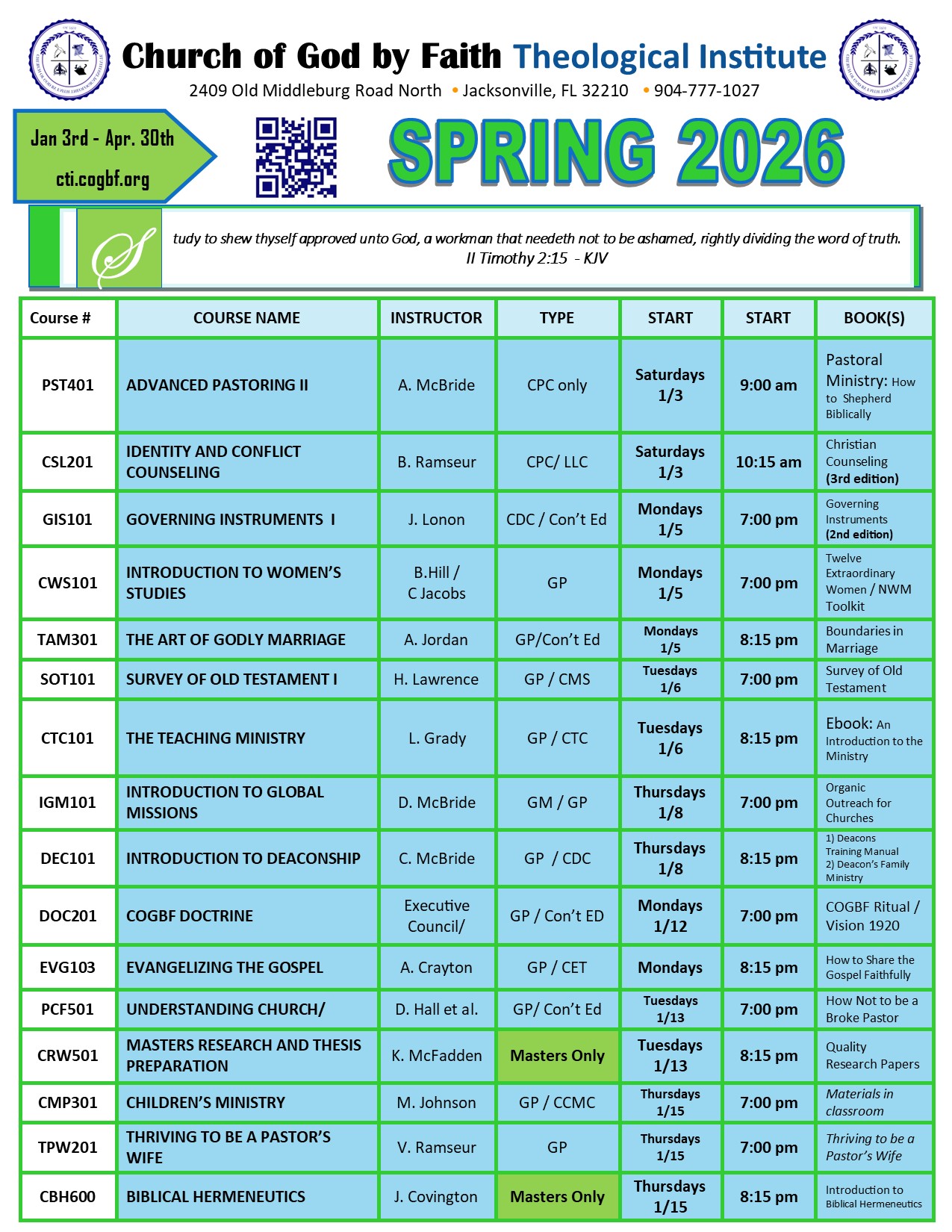 CTI IS AUTHORIZED – The Church of God by Faith Theological Institute (CTI) is registered under Section 1005.06(1)(f), Florida Statutes and Rule 6E-5.001. of the Commission of Independent Christian Education by the State of Florida. CTI was also approved as an 501c3, Independent Christian College by the Federal Government.